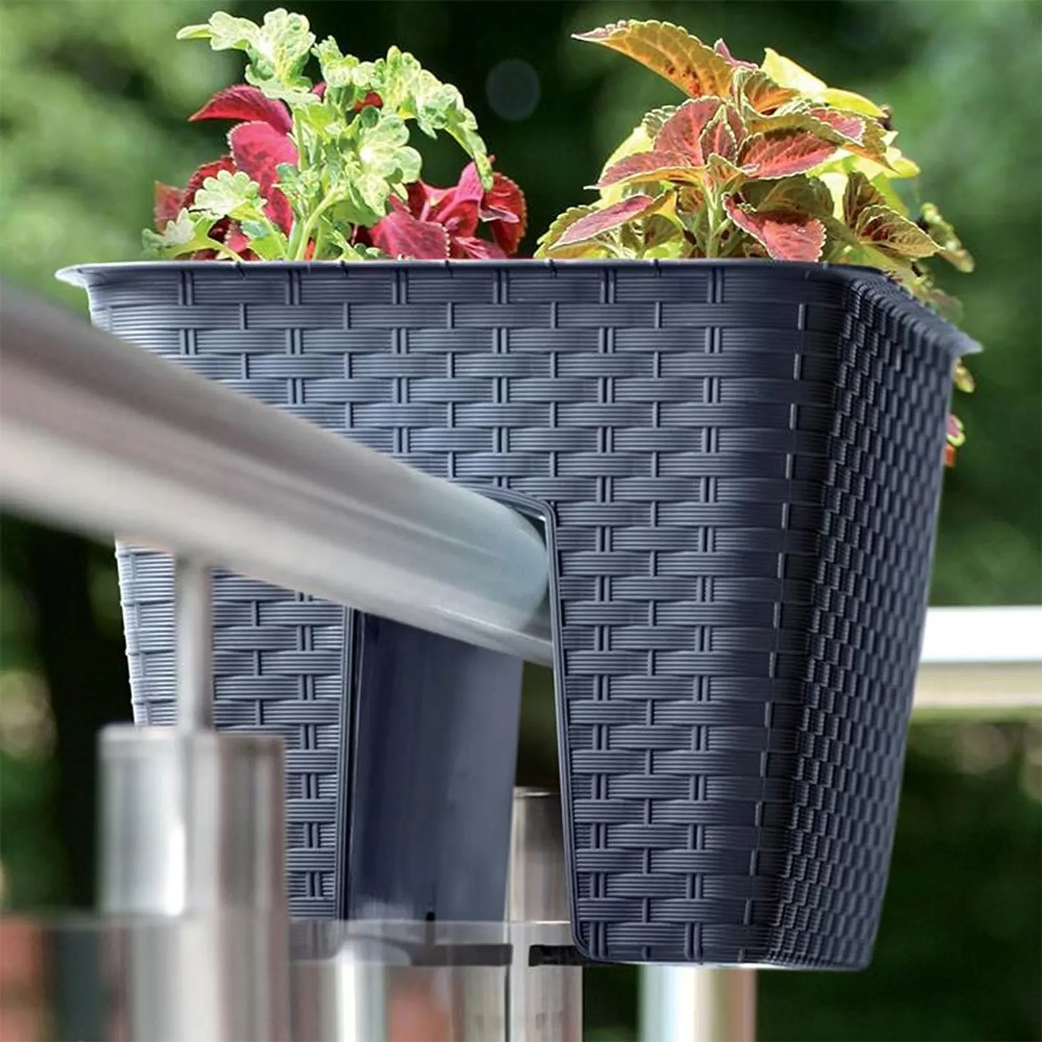Der Ratolla Blumentopf von Prosperplast ist ein quadratischer Blumenkasten mit Rattan-Textur, ideal zur Montage an Geländern und Brüstungen. Perfekt für Balkon, Terrasse oder Innenbereiche. Das Design dekoriert beide Seiten des Geländers und schafft einen attraktiven Blick von innen wie außen.