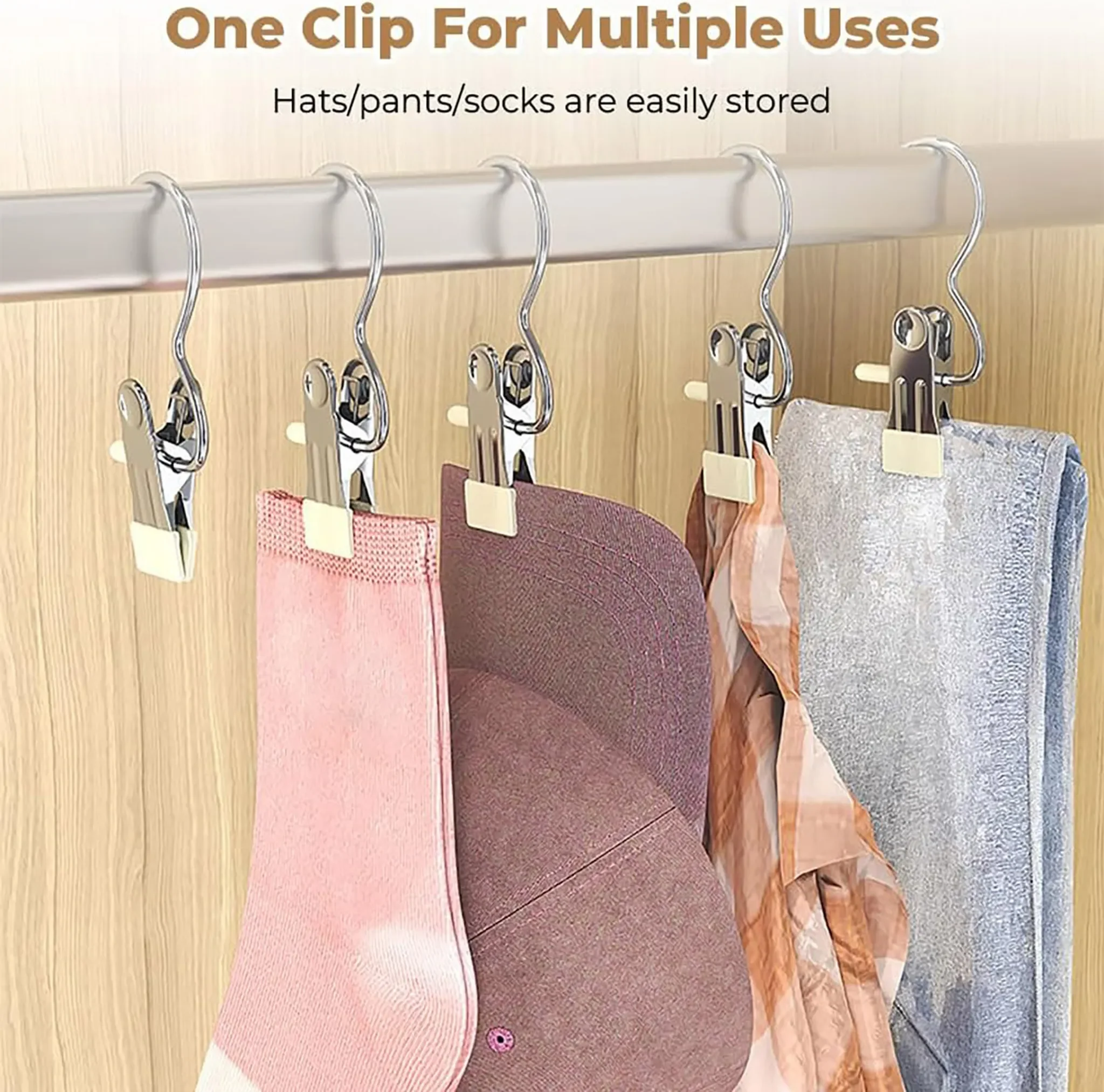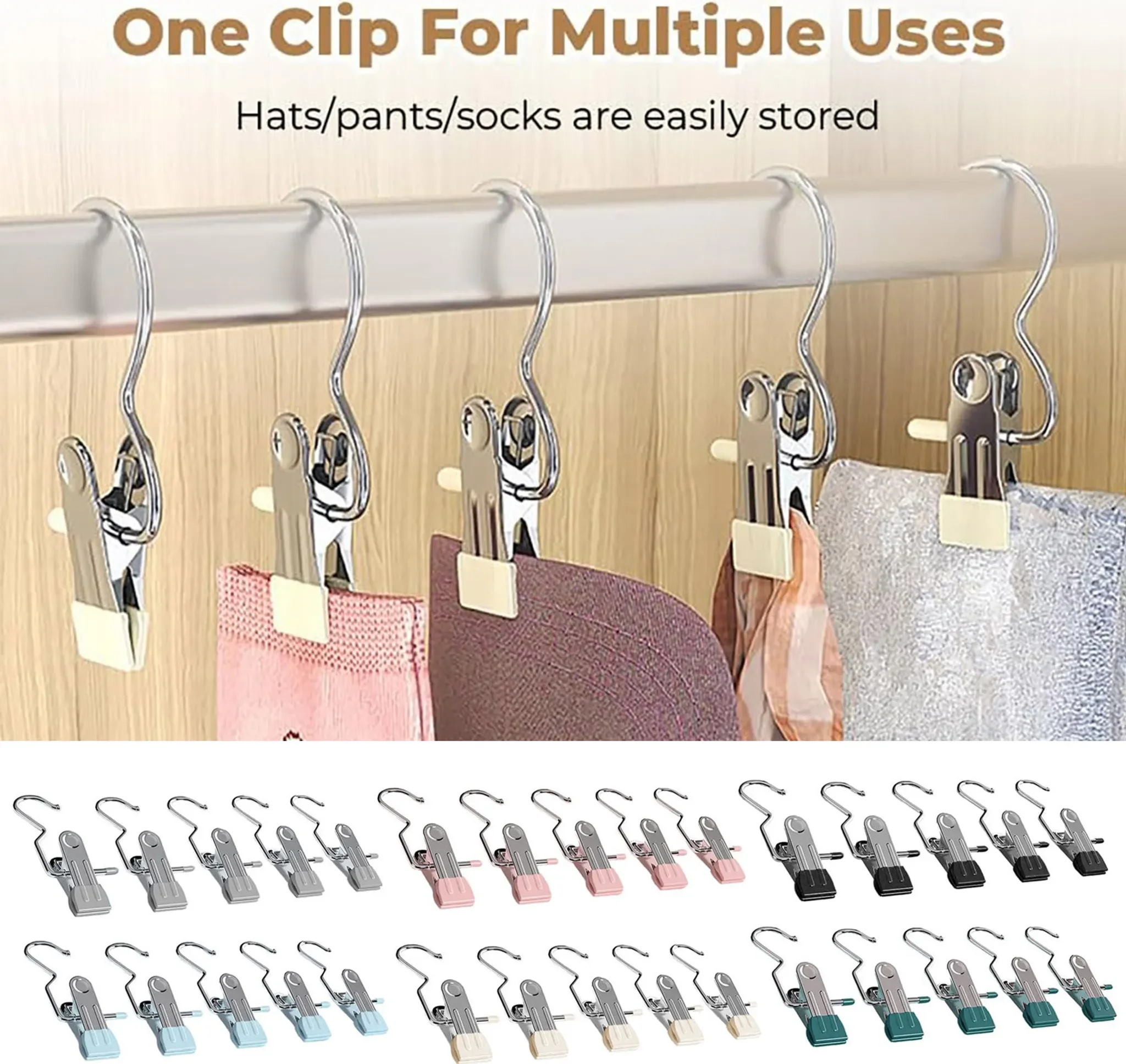 Die robusten Metallclips sind mit einer weichen, rutschfesten Gummibeschichtung versehen, die Kleidung und Accessoires zuverlässig schützt. Durch die 360-Grad-Drehfunktion lassen sich Hosen, Hüte, Taschen oder Handtücher flexibel und übersichtlich aufhängen.