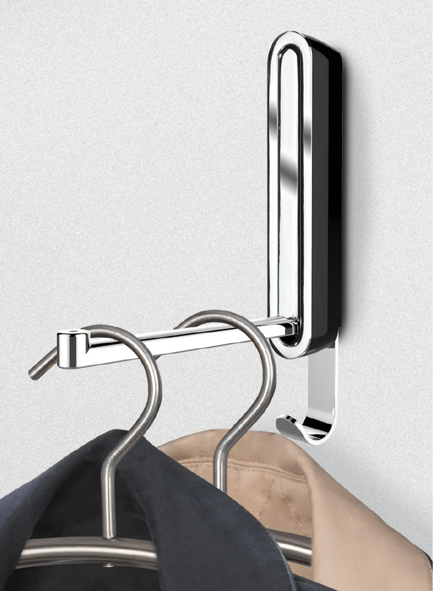 Der integrierte Klapphaken ist magnetisch fixiert und lässt sich durch leichten Fingerdruck bequem aus- oder einklappen. Zusätzlich verfügt der Wandhaken über einen permanenten Zusatzhaken aus Metall, der weitere Aufhängemöglichkeiten bietet – ideal für Jacken, Mäntel, Handtücher oder Küchenaccessoires.