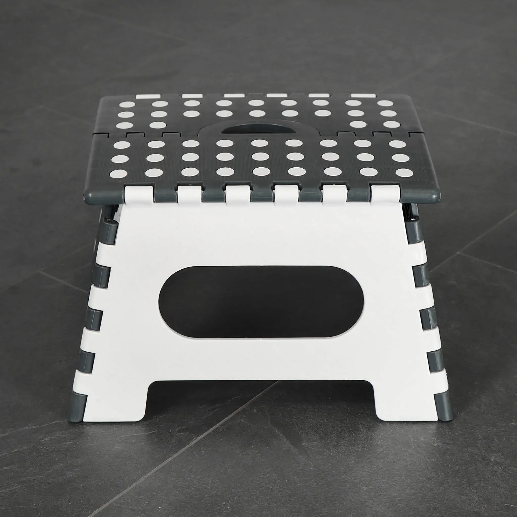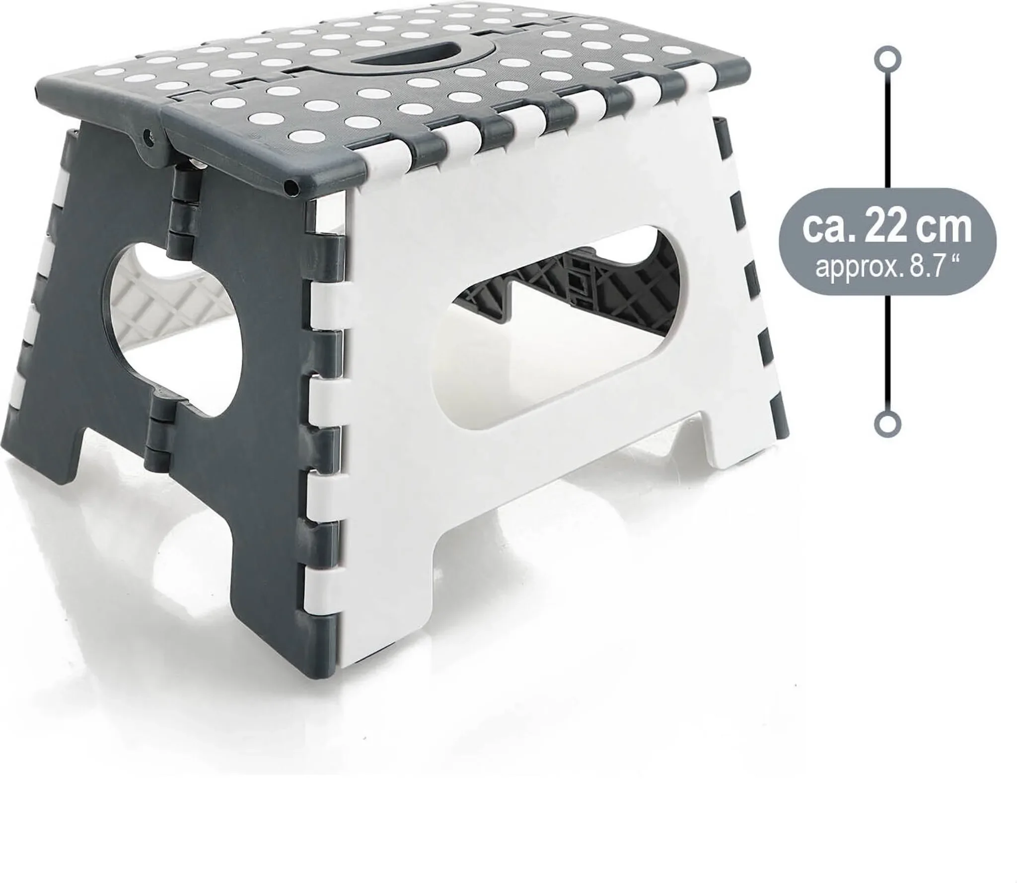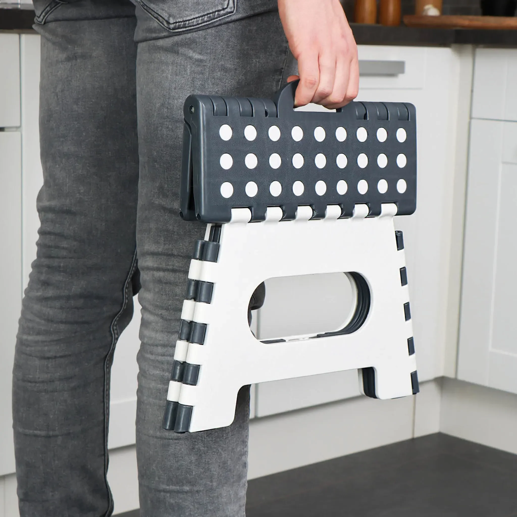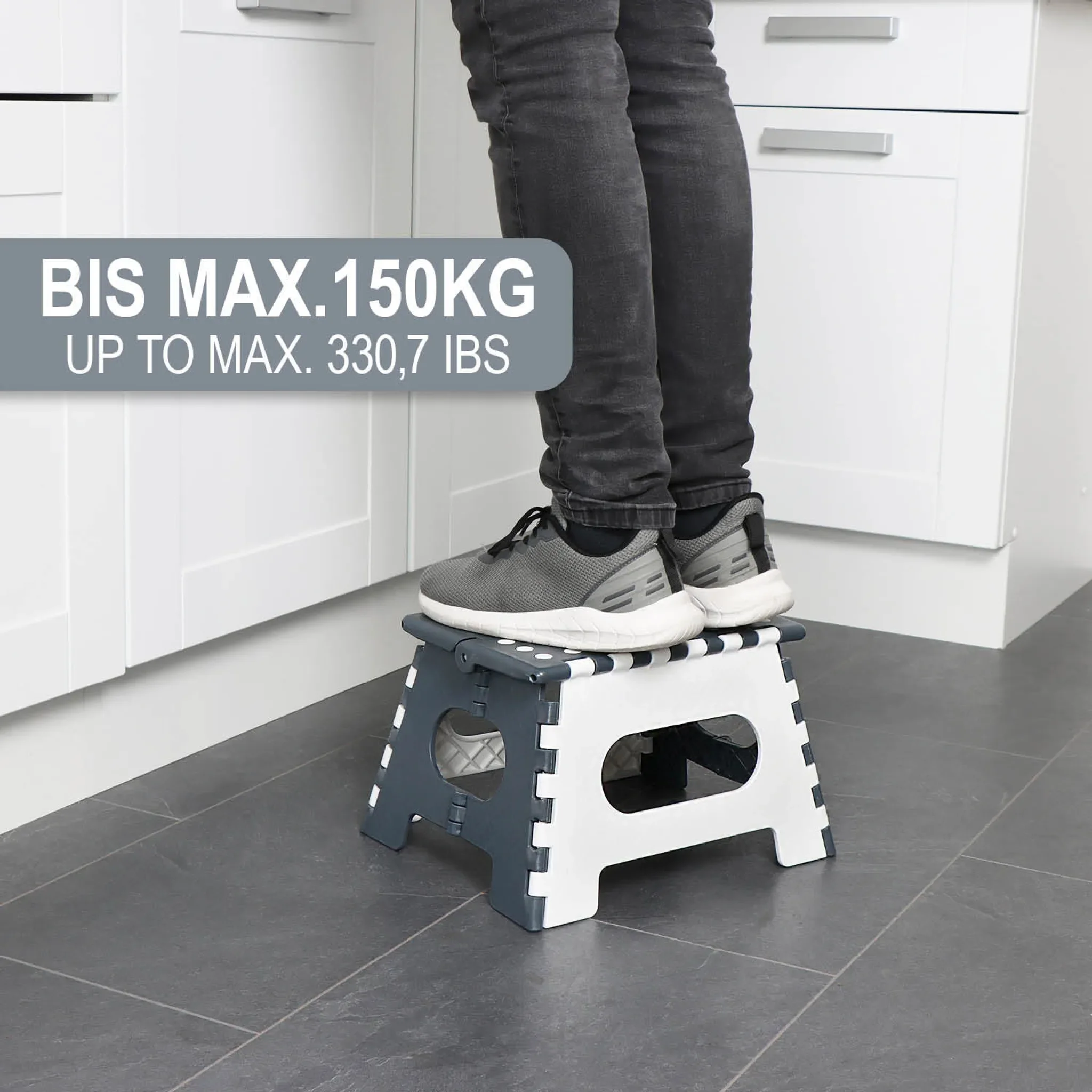 Die Trittfläche mit Gumminoppen sorgt für einen sicheren Stand, während der stabile Kunststoffrahmen eine hohe Belastbarkeit ermöglicht. Dank Klappfunktion und integriertem Tragegriff lässt sich der Tritthocker leicht transportieren und platzsparend verstauen.