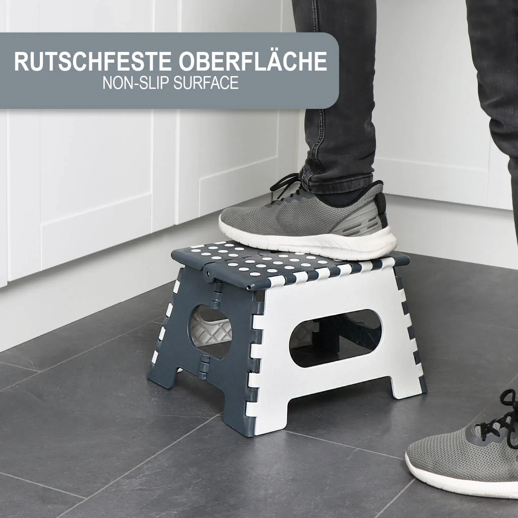 Klapptritt mit Gumminoppen – Rutschfester Tritthocker, Weiß/Grau
