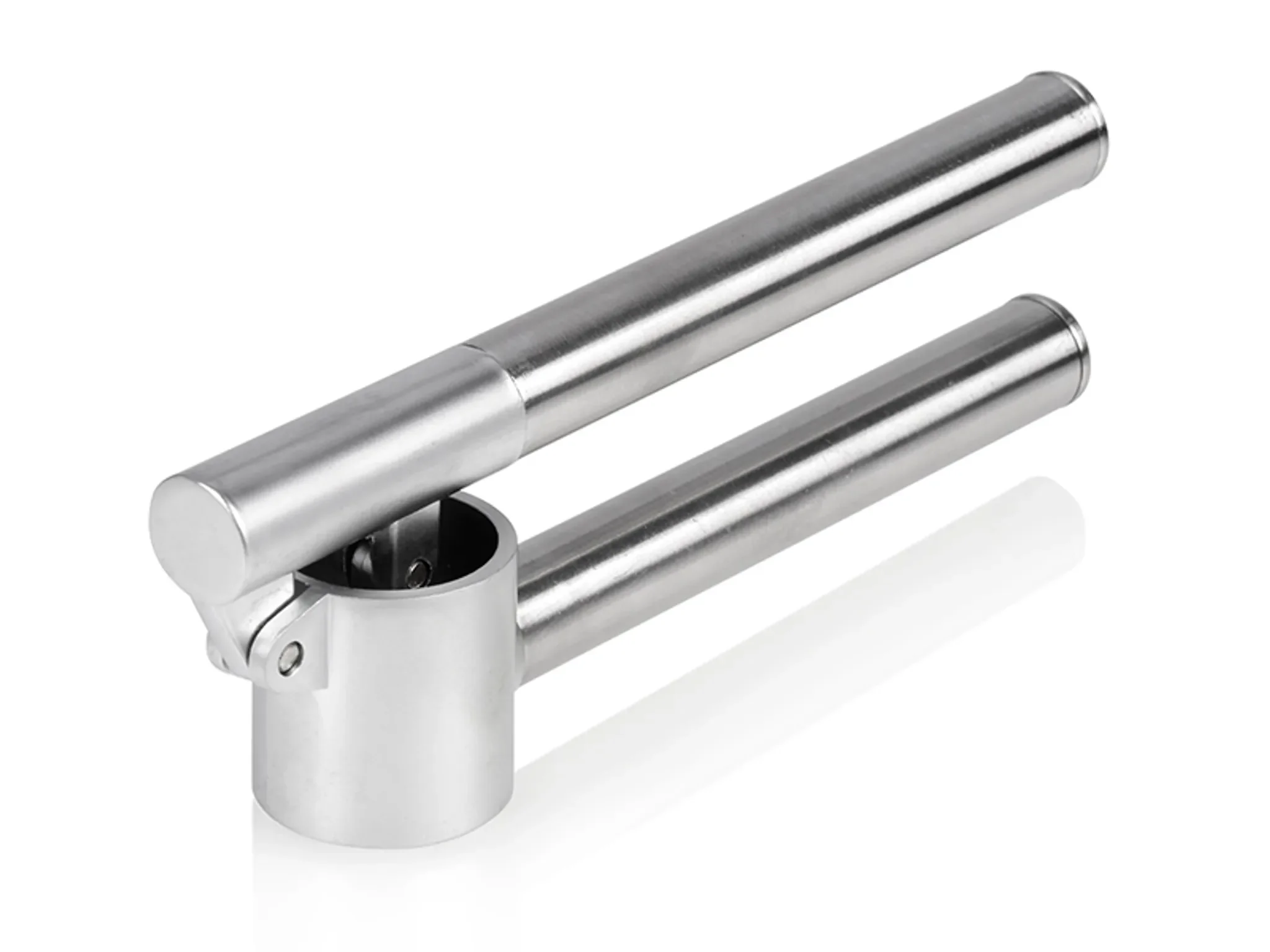 Diese professionelle Knoblauchpresse kombiniert hochwertiges Edelstahlgehäuse mit einem inneren Presskopf aus Aluminium. Das innovative Presssystem mit lebensmittelechten Noppen führt den Knoblauch vollständig durch das Sieb – für maximale Ausbeute ohne störende Rückstände.