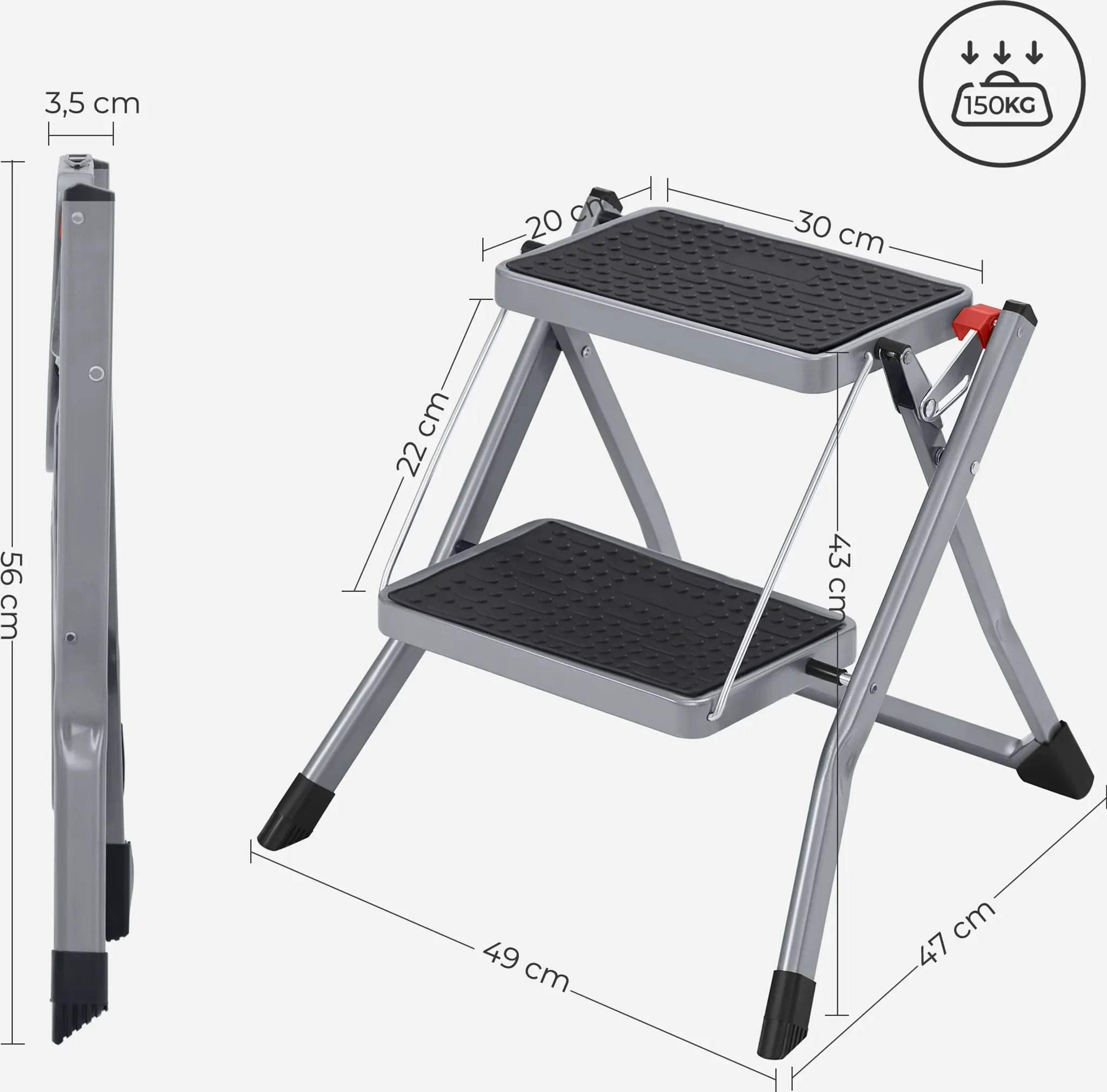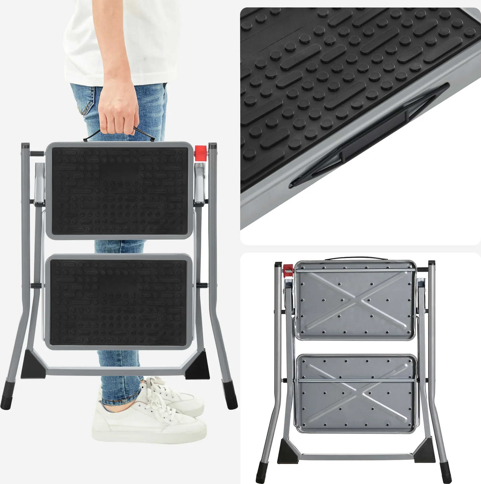 Trittleiter mit 2 Stufen – Klapptritt aus Stahl, Grau/Schwarz