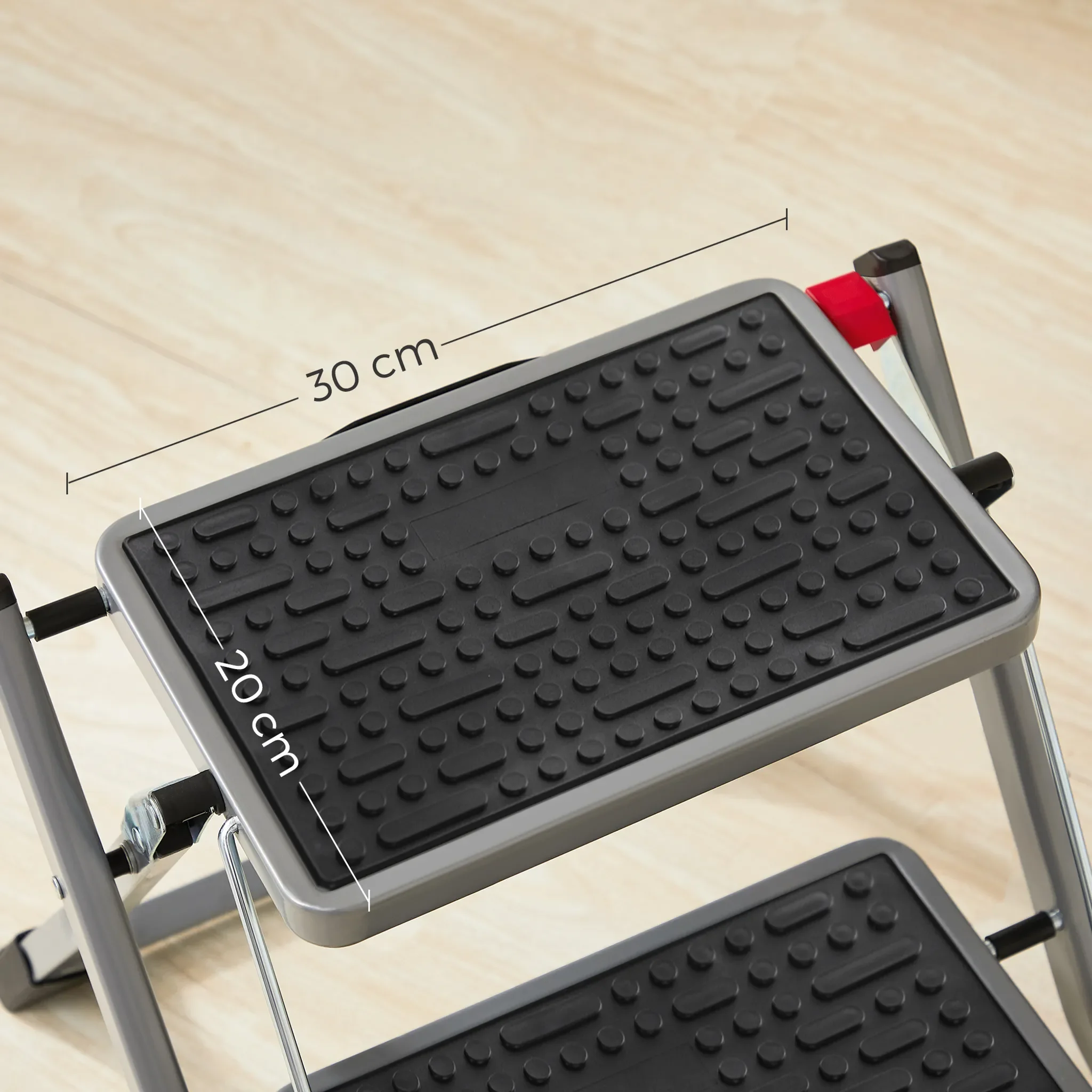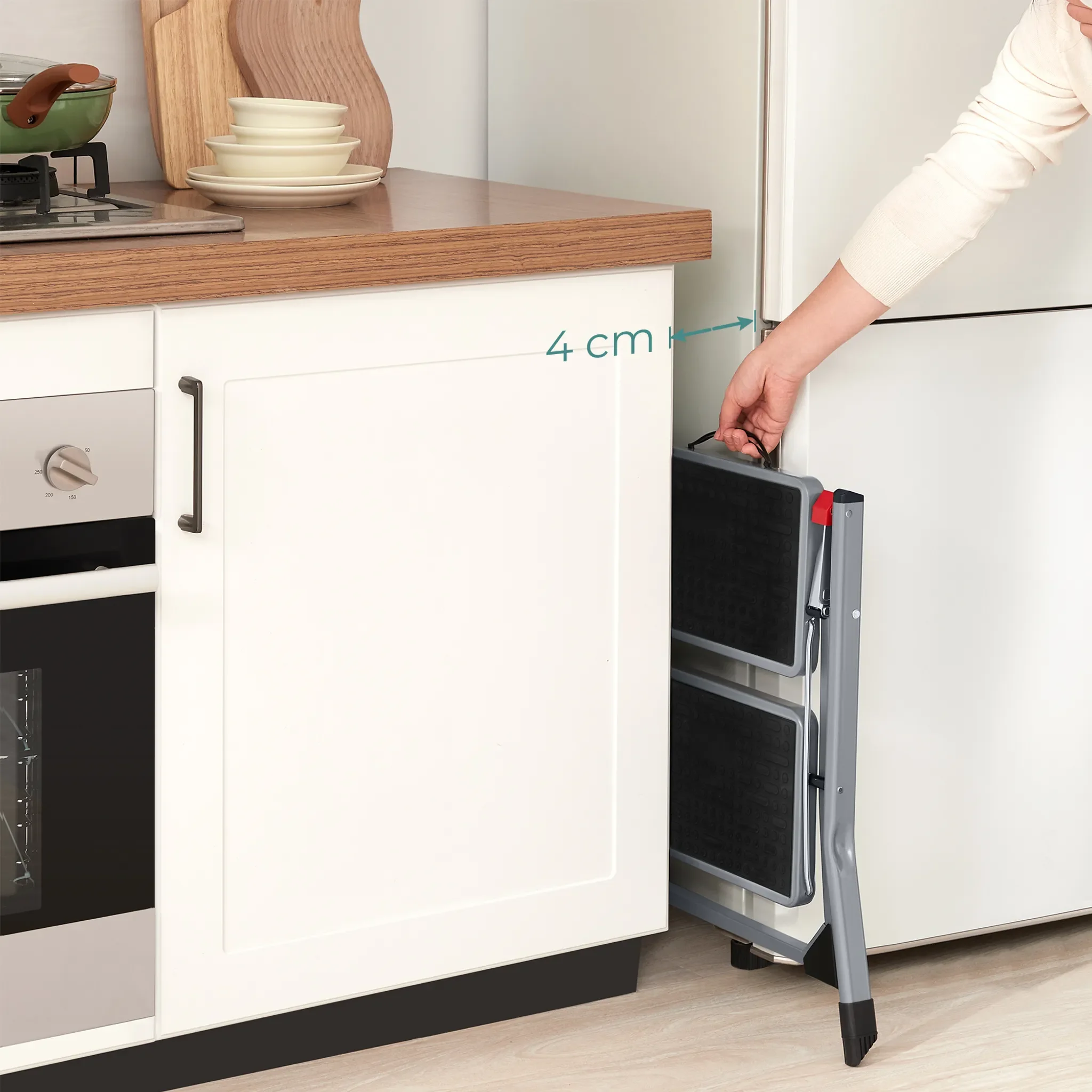 Dank des klappbaren Designs lässt sich die Leiter besonders platzsparend verstauen. Die rutschfesten Trittflächen mit Antirutsch-Matten sowie gummierte Füße sorgen für einen sicheren Stand und schützen empfindliche Böden vor Kratzern.